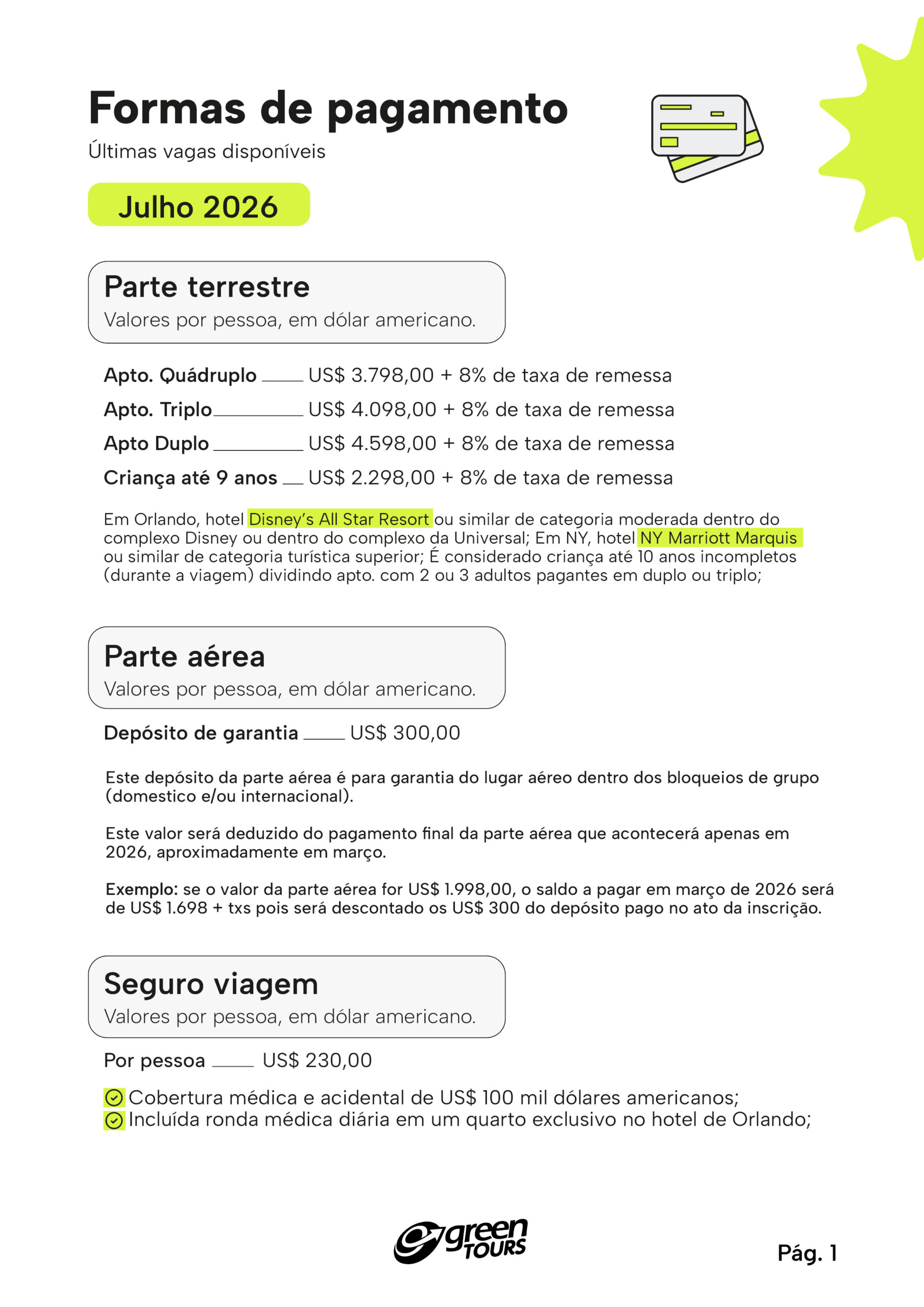 O que significa parte terrestre, seguro viagem e parte aérea da viagem?Parte terrestre é basicamente tudo que está mencionado no roteiro da viagem: hotel nas cidades visitadas, acompanhamento dos 3 monitores por grupo, dos coordenadores, do coordenador médico, os traslados privativos, as 3 festas com os 3 jantares, city tour em NY, walktours em NY, os passeios nos shoppings e lojas, os tkts dos 9 parques temáticos, etc... Só não está incluso na parte terrestre os opcionais e sugestões e a alimentação (exceto os 3 jantares e pic nic em julho). Lembre-se: além da parte terrestre todos devem acrescentar o seguro viagem oferecido pelo Green, seguro este que também é responsável pela organização da Ronda Médica diária em Orlando. Na parte terrestre incide a taxa de remessa governamental que será de 8% para 2026, esta taxa não incide sobre o seguro, por isso os valores são anunciados separadamente. A parte aérea é um bloqueio de grupo feito de forma antecipada, os lugares são em classe econômica, tanto nos trechos domésticos, internacionais e nos trechos dentro dos EUA. Também faz parte o acompanhamento dos monitores nos mesmos vôos + o depósito de garantia dos lugares junto à cia aérea que é feito pelo Greentours de forma antecipada + a garantia da cia aérea que todos do grupo viajarão nos mesmos voos internacionais e terão o mesmo valor!