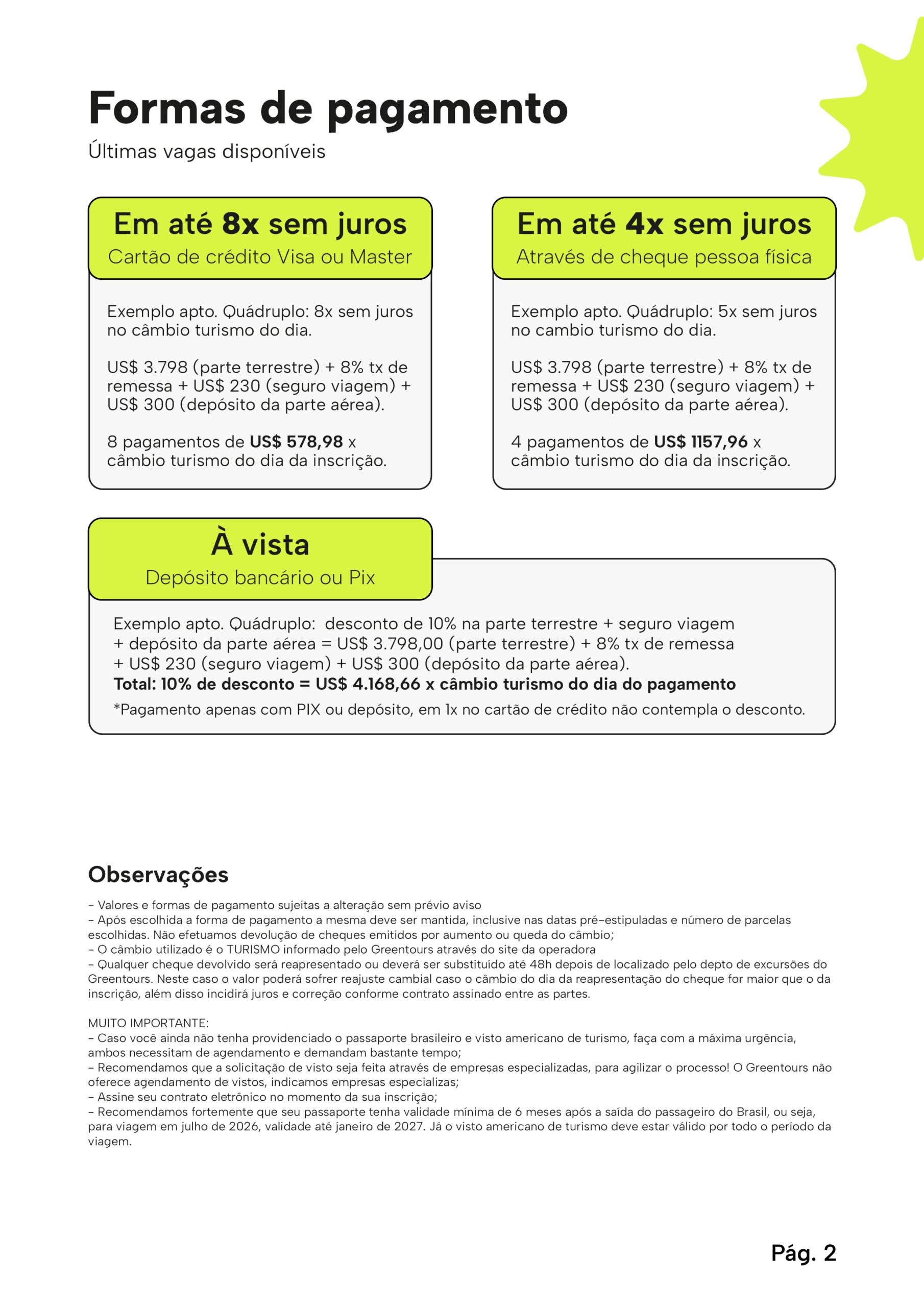 As Condições Gerais específicas deste programa (parte terrestre e aérea ) se encontram à disposição no Greentours Viagens e Turismo. Os valores e a programação de julho de 2026 foram lançados oficialmente dia 6 de agosto de 2025. As inscrições somente são válidas com contrato eletrônico assinado entre as partes e com a comprovação de pagamento para o Greentours.